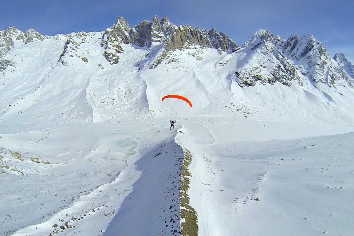 Over the next ten days Niall and I basically just ran around having as much fun as we could. We summited two beautiful, unnamed peaks and flew off the very tops of each with our speedwings. We had three more flights from high mountain slopes, which proved to be rather more dramatic than we had planned. We made the first ascent of a 100m ice cascade which we named ‘The Ephemeral Avalanche’ and went at around Scottish V/VI. And we spent the rest of our time downhill skiing, kite-skiing, eating Haribo, and exploring the local ice caves!