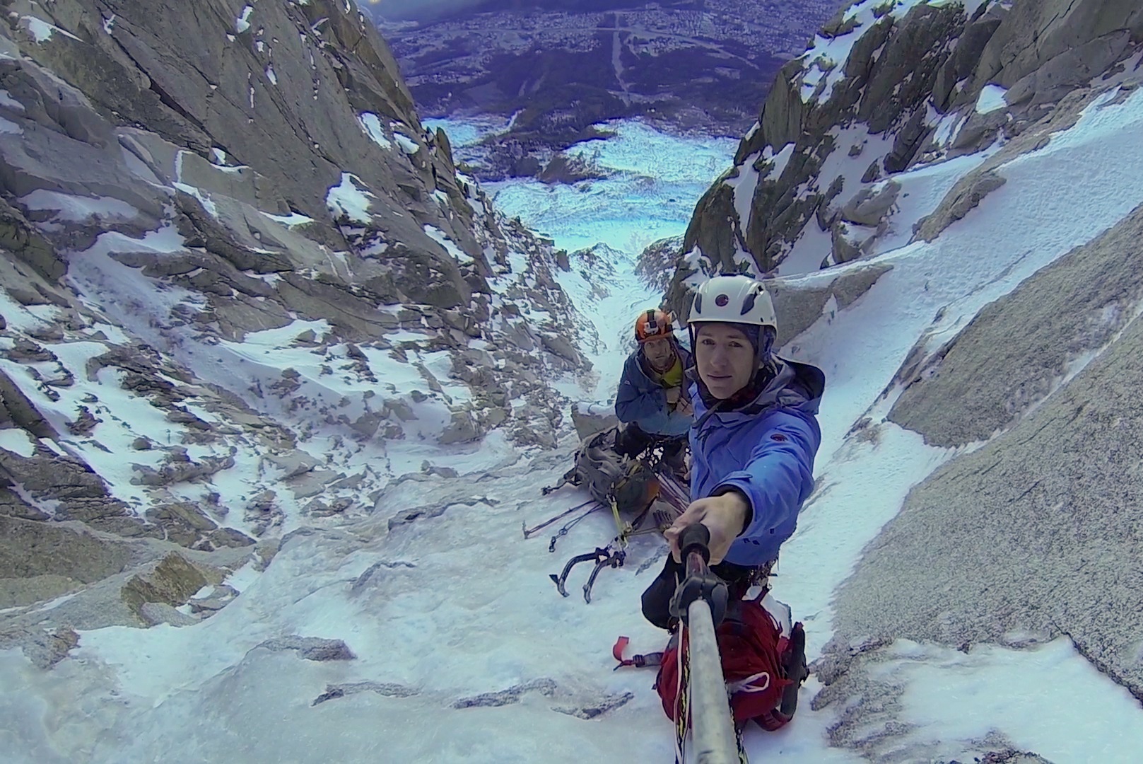 The climb got off to a bad start as I was hit in the shoulder by a head-sized lump of granite which had fallen from 20 metres above me. The impact knocked me off my feet leaving me hanging upside down from my ice-screw and ripped a hole through three layers of clothing. At least it didn’t hit me in the face! Adrenaline got me through the rest of the day as my shoulder slowly stiffened up.