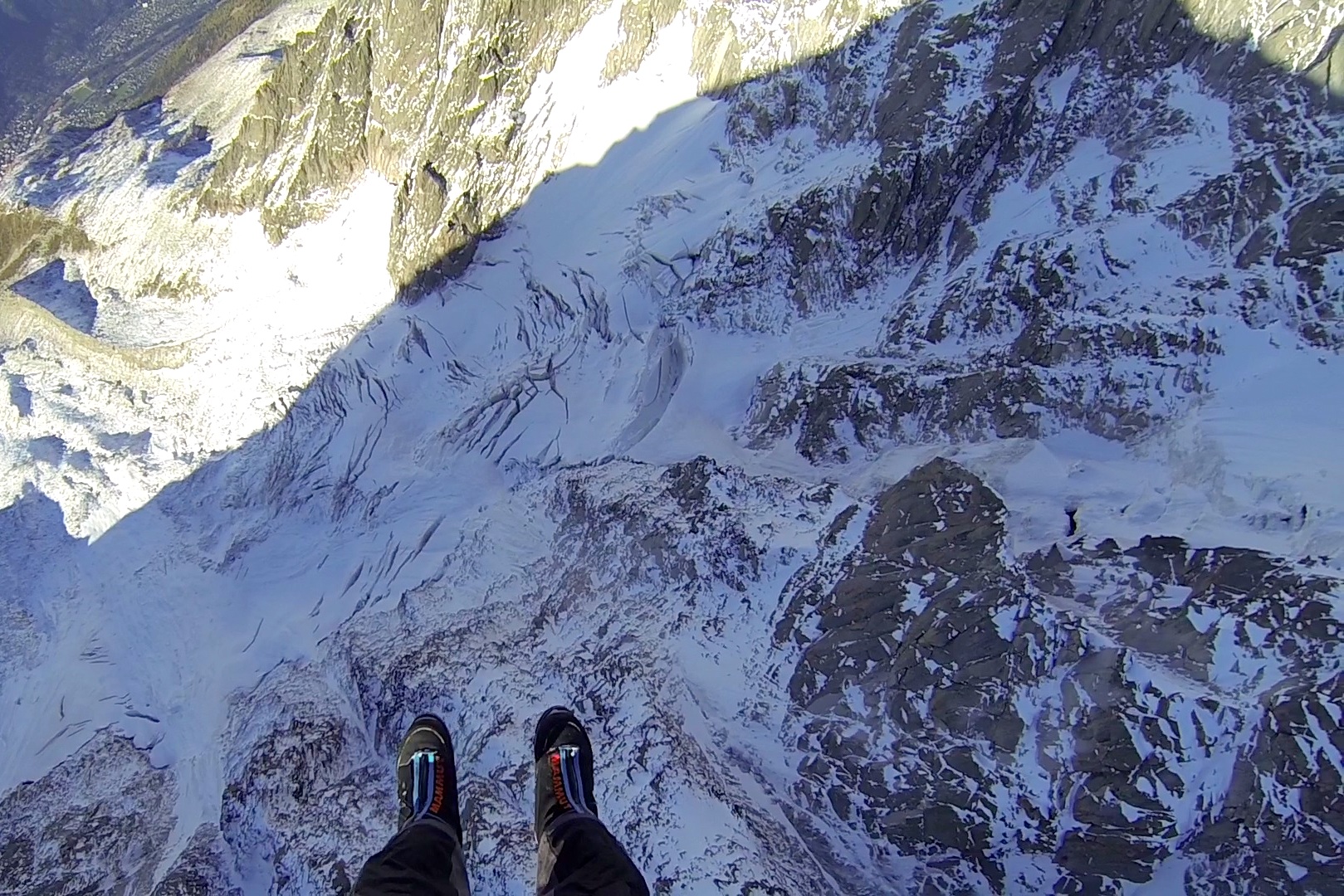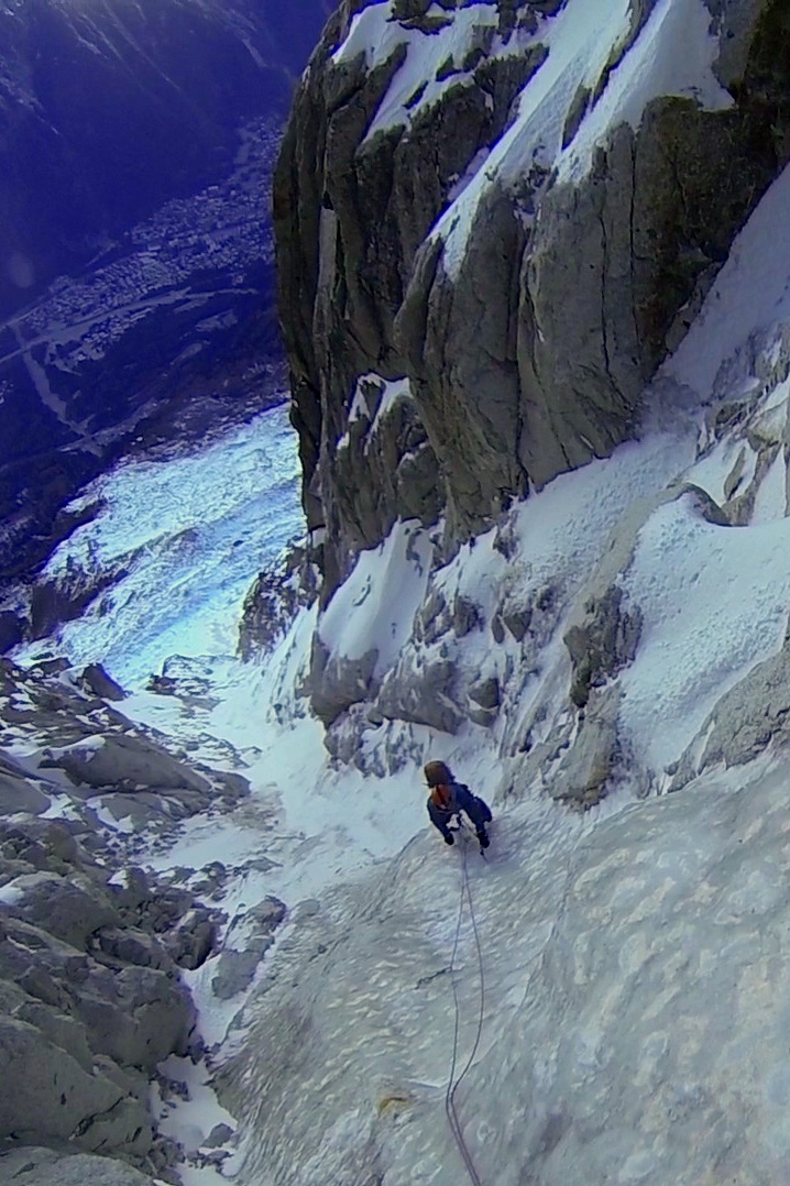 We intended to climb the North Face of the Grandes Jorasses and launch off the top, but a heavy dump of snow and a Northerly wind put an end to that plan. There are no North facing launch sites on the mountain, and the South side would have been dangerously avalanche prone meaning that we would have been climbing into a trap where we could neither fly off nor safely descend on foot to the South. So with only two days of good weather to play with we picked out the Eugster Direct on the North Face of the Aiguille du Midi.