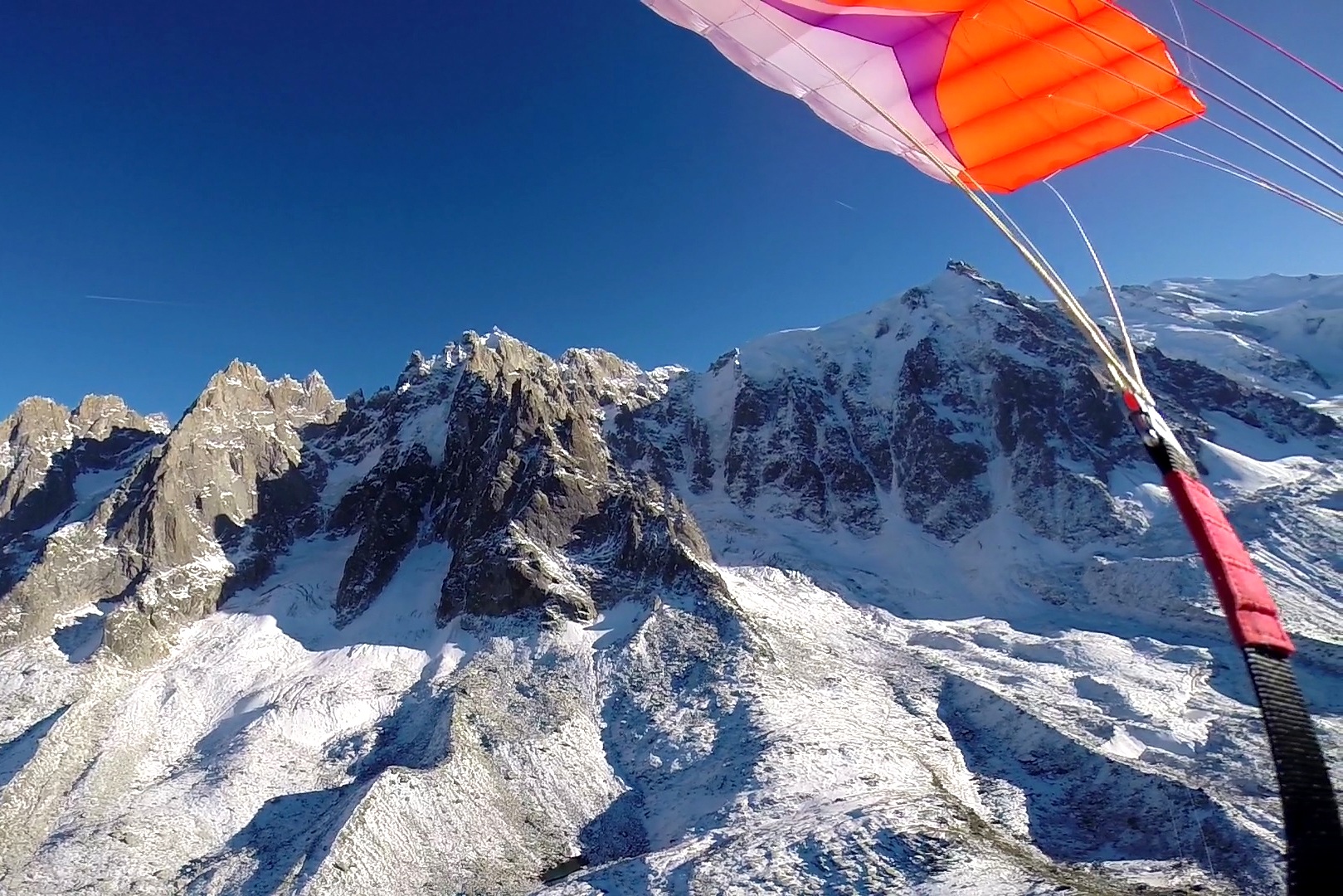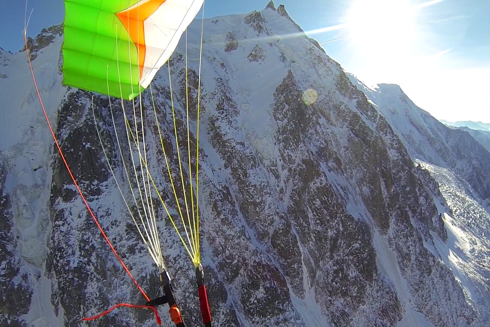 The rest of the route went wonderfully smoothly. The route was in pretty good condition with only a few sections of very thin delicate ice which had to be climbed with great care, despite this we climbed fast and topped out onto the summit ridge before 3pm. Out came the wings and we scouted out a good launch area. Wilki drew the short straw and launched first, then it was my turn. I must say it felt amazingly un-daunting running off the edge of 1000m mountain face! The views were spectacular and I didn’t want the flight to end, but 8 minutes and 2,700 vertical metres later Wilki and I simultaneously touched down in Chamonix.