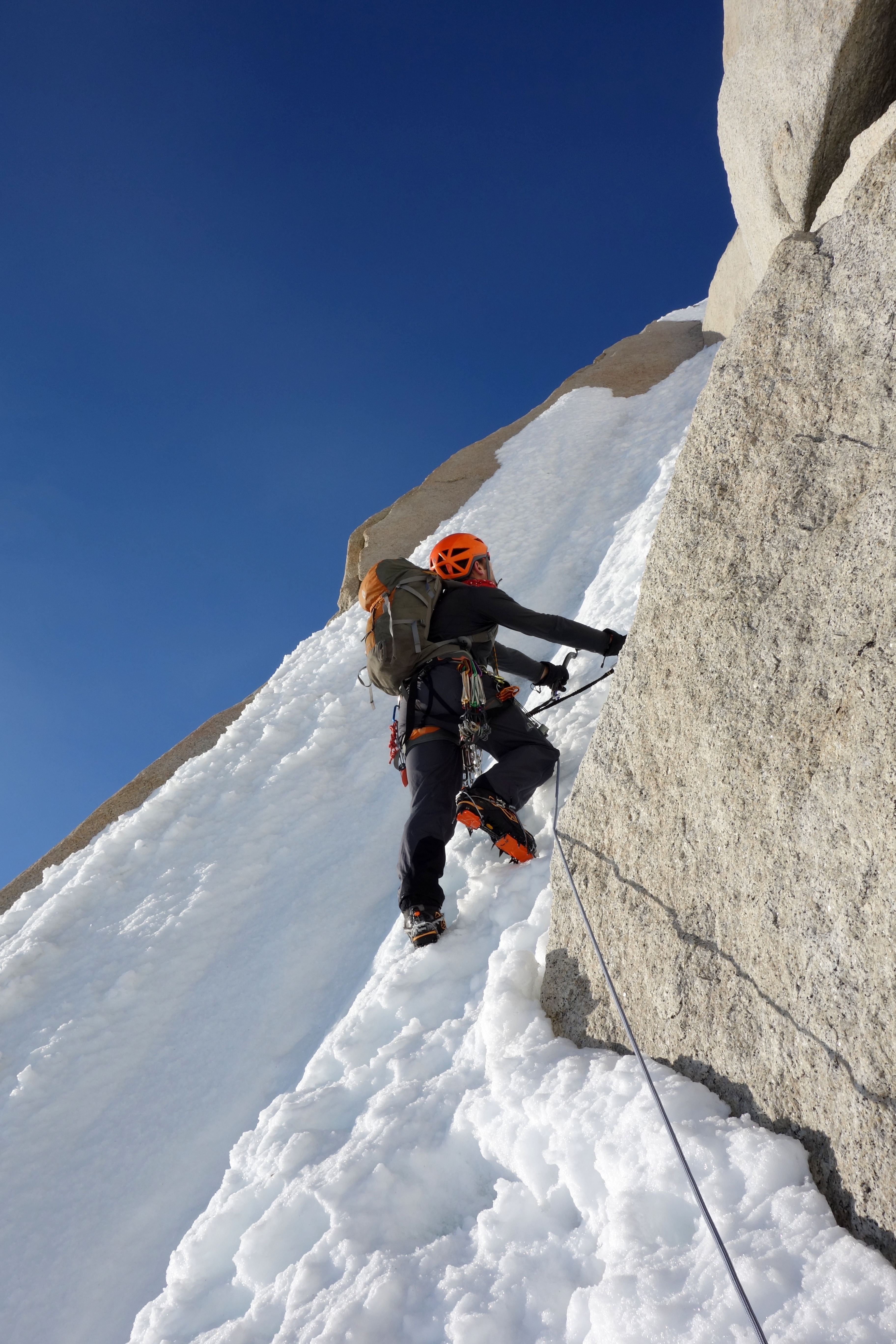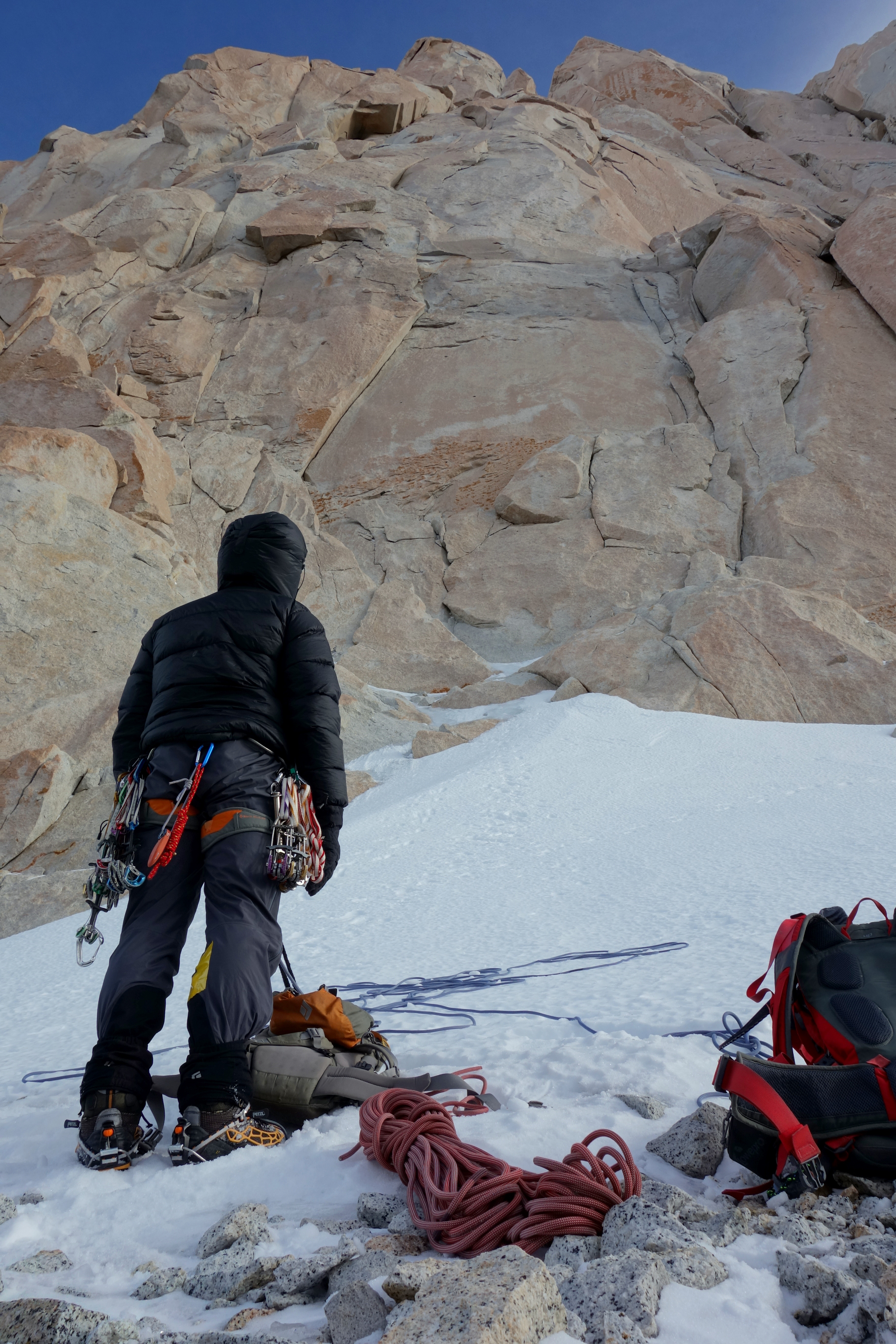 We left our camp at 2am under the starriest night sky I have ever seen, and without a trace of a wind. The snow conditions were excellent and we felt fit and well rested. The hike up to the top of the glacier took us just one hour (it took us nearly 3 hours on our previous Poincenot mission) and from there we set off climbing up the steep slopes that form the lower flanks of Cerro Fitzroy. Over the next 4 hours we covered a lot of very varied terrain; a never ending ice slope, a precarious rocky ridge, an exposed hanging ramp, and finally a section of mixed climbing to access a snow patch at the base of the Fitzroy headwall. The wind first made an appearance when we hit the rocky ridge and by the time we reached the base of the headwall it had intensified to the point of being a real concern. Above us loomed 400m of vertical granite, the likes of which would require exposed hands and, ideally, thin rock boots in order to ascend. Every 30 seconds or so a snow devil would engulf us and force us to retreat into our down jackets. This was not ideal!